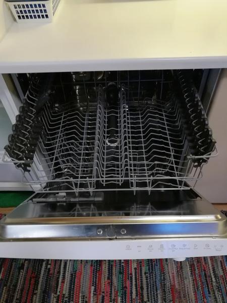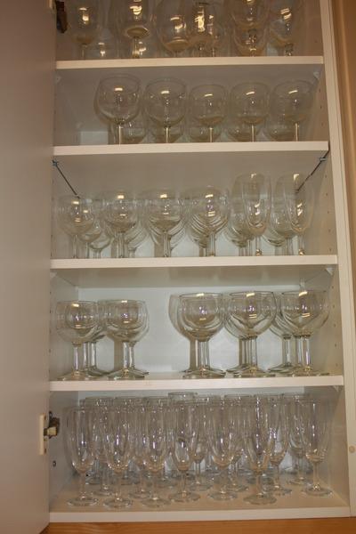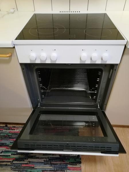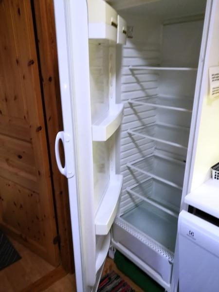 Keittiöstä löytyy myös kattiloita, tarjoiluastioita, ottimia sekä pieni pakastin ja mikro.
